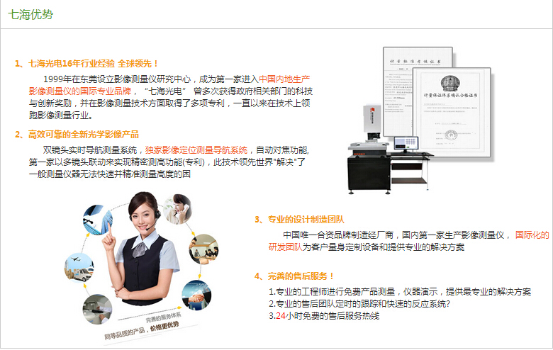 七海測量技術(深圳)有限公司的前身美國“七海光電”成立于1990年,位于紐約市,1999年在東莞設立影像測量儀研發中心,成為*家進入中國內地生產影像測量儀的國際專業品牌, “七海光電”曾多次獲得政府相關部門的科技與創新獎勵,并在影像測量技術方面取得了多項專利,一直以來在技術上領跑影像測量行業。其產品已廣泛應用在通信、電子、汽車、塑膠,機械加工等行業,并且能夠根據用戶的特定需求,快速提供用戶定制化的產品和解決方案,成為中國領先的影像測量機供應商之一,不斷帶領中國影像測量行業屢創新高。